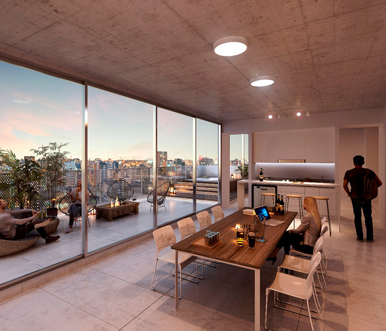 Edificio de 10 plantas con 90 unidades tipo estudio. Incluye exclusivos departamentos con patios en el primer piso y departamentos con amplias terrazas en el piso 9 que cuentan con parrillas. Cuenta con una gran variedad de amenities tales como un gimnasio, Sky Club en el piso 10, co-working SUM, jacuzzi, lavadero, y un extenso solarium. Cuenta también con monitoreo de seguridad 24 hs Control de accesos e Intercomunicación entre unidades y zonas comunes.